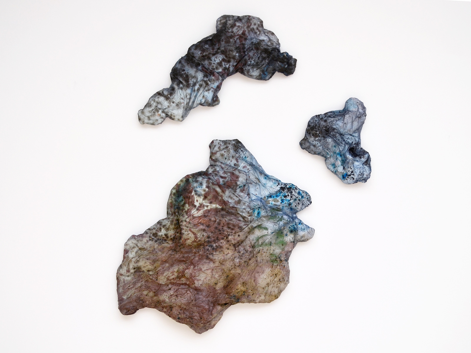 Lecanora muralis trouve son inspiration dans le lichen, cet organisme issu de la symbiose entre une algue et un champignon qui se propage sur différentes surfaces. Je formule l’idée d’un devenir symbiotique des êtres et de leur environnement comme futur désirable. L’oeuvre invite à une reconnexion spirituelle et sensible avec la Terre et bien que son processus de création soit semblable à la peinture, sa matière finale résulte d’une alliance avec une algue rouge, une cyanobactérie, des pigments naturels et des bactéries. C’est un véritable écosystème où le vivant habite et cohabite, une sorte de «peau-monde» sculptées de plis rivières et de reliefs géologiques. Lecanora Muralis a été créée à partir de matériaux biosourcés, organiques et locaux.