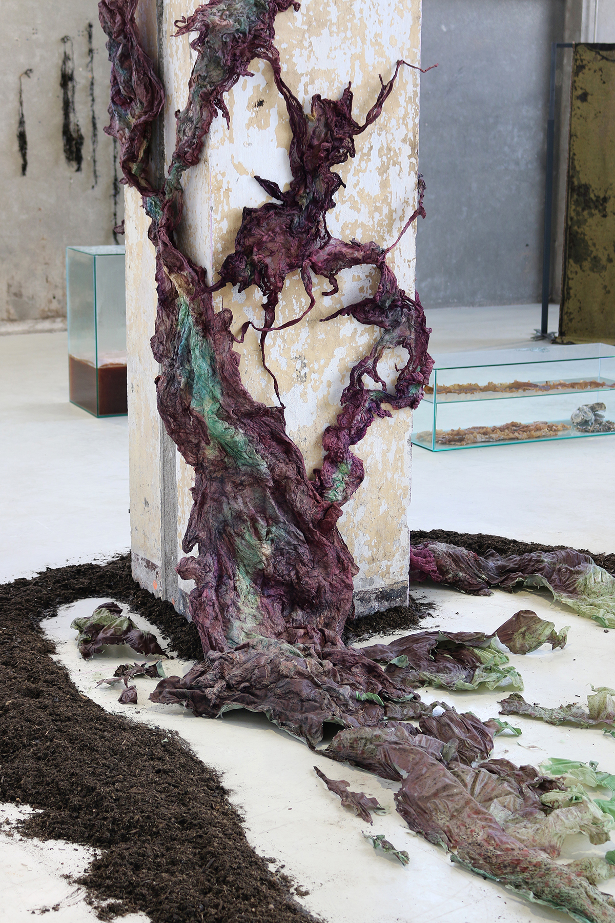 Proliférer, déborder, propulser des spores, accueillir les relations symbiotiques, faire peau commune avec l’espace d’exposition, telle est la démarche. Le long de l’architecture grimpent des tentacules lianes spiralant vers le ciel, comme magnétisées par les astres. Elles prennent racine dans un bouillon organique, un creuset cosmogonique contenant un mélange d’algue (agar agar) et de cyanobactéries (spiruline), des micro-algues qui en proliférant il y a 2,4 milliards d’années avaient créé la couche d’ozone nécessaire à l’apparition des formes de vie que nous connaissons aujourd’hui. Cette rivière primitive sert de niche reproductrice pour les bactéries présentes dans l’air du lieu, qui l’ont pigmentée de leurs spores. Quand toute l’eau s’est évaporée, la gelée d’algue s’est transformée en une mue serpentine.
