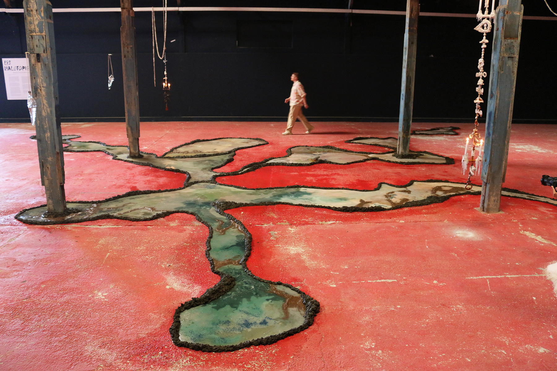 « Charlotte Gautier Van Tour déploie au sol une installation, intitulée Les Territoires des Vies Minuscules. Celle-ci est évolutive, vivante, ses matières sont celles des vies microbiennes qui enrichissent le vivant des Salins, ses formes s’inspirent des bassins de collecte qui sont des biotopes riches en biodiversité et à ce titre des trésors à préserver. L’installation témoigne d’un lien de symbiose avec les éléments de nature. L’artiste laisse à ses minuscules êtres leur part d’autonomie dans sa création, leur droit fondamental à nous surprendre et nous émerveiller. » Christopher Yggdre