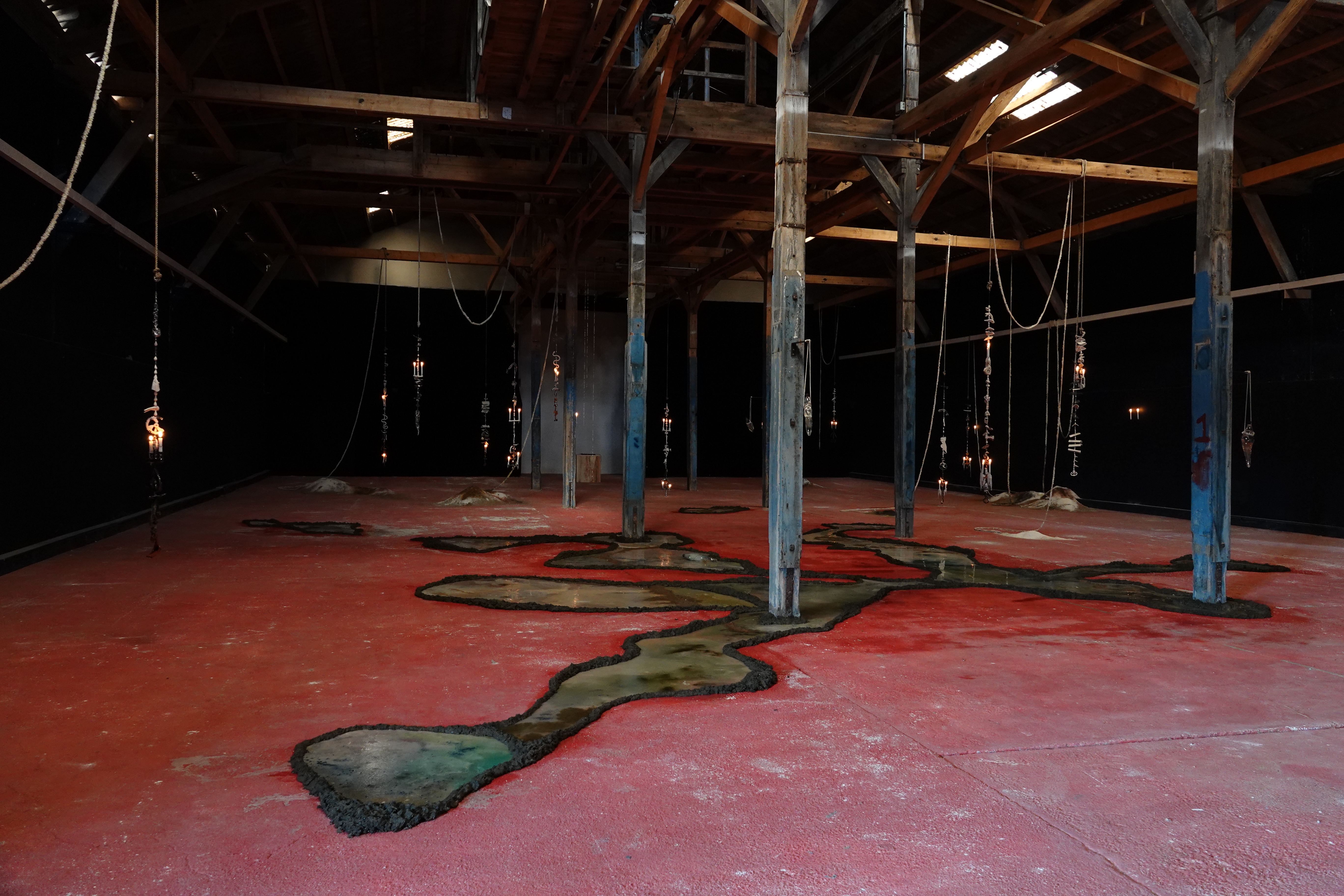Les Dissolutions de Marion Flament sont un ensemble de quatorze chapelets suspendus depuis les charpentes jusqu’au sol où ils semblent se dissoudre ou se mêler au sable, au sel, et aux poudres de rouille. Réalisés en verre, faïence, terre brute ou émaillée, ils se composent d’éléments, signes, et traces, glanés sur le site des Salins qui disent l’histoire des lieux, des partages qui s’y sont négociés. Chaque chapelet est une ligne